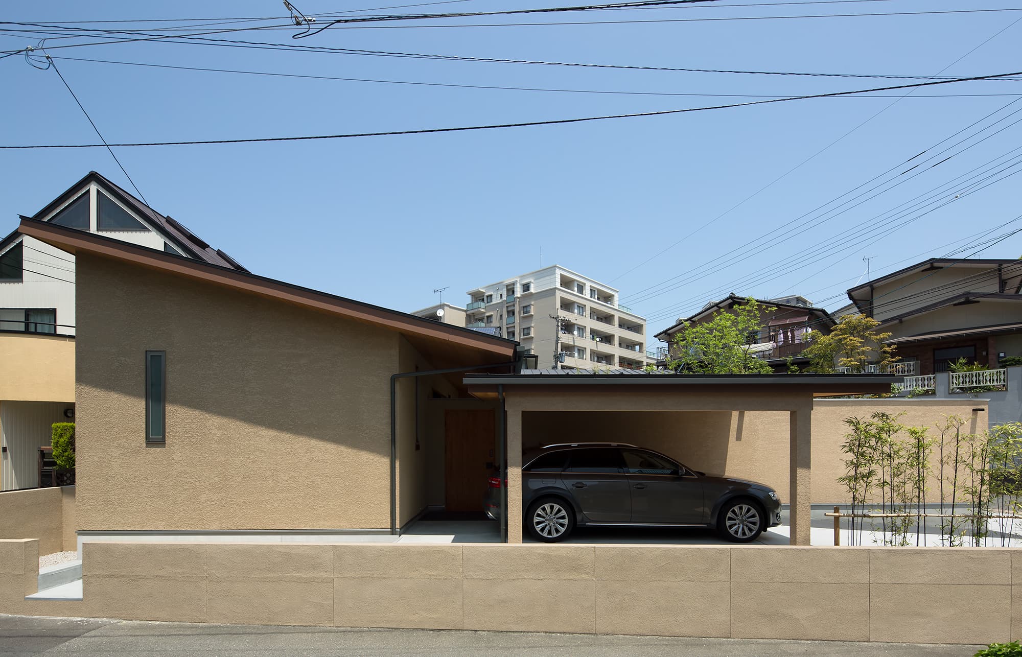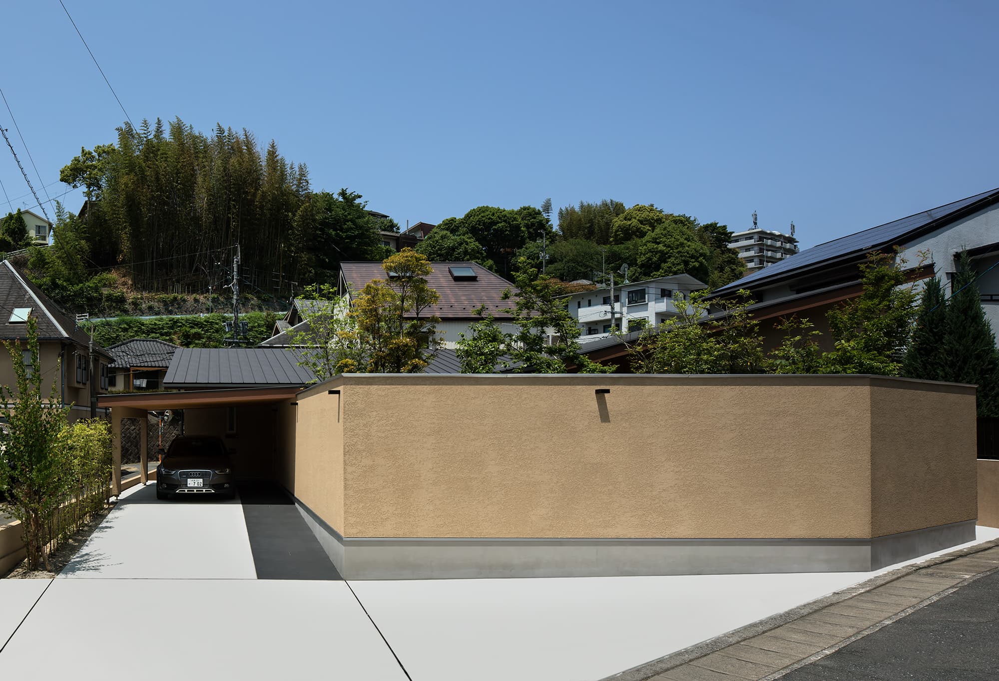敷地の周りを近隣住戸に囲まれた敷地で、南東側は高台から見下ろされる条件の中でプライバシーを確保しつつ、開放性のある住宅を創るために、広い中庭空間を設けました。