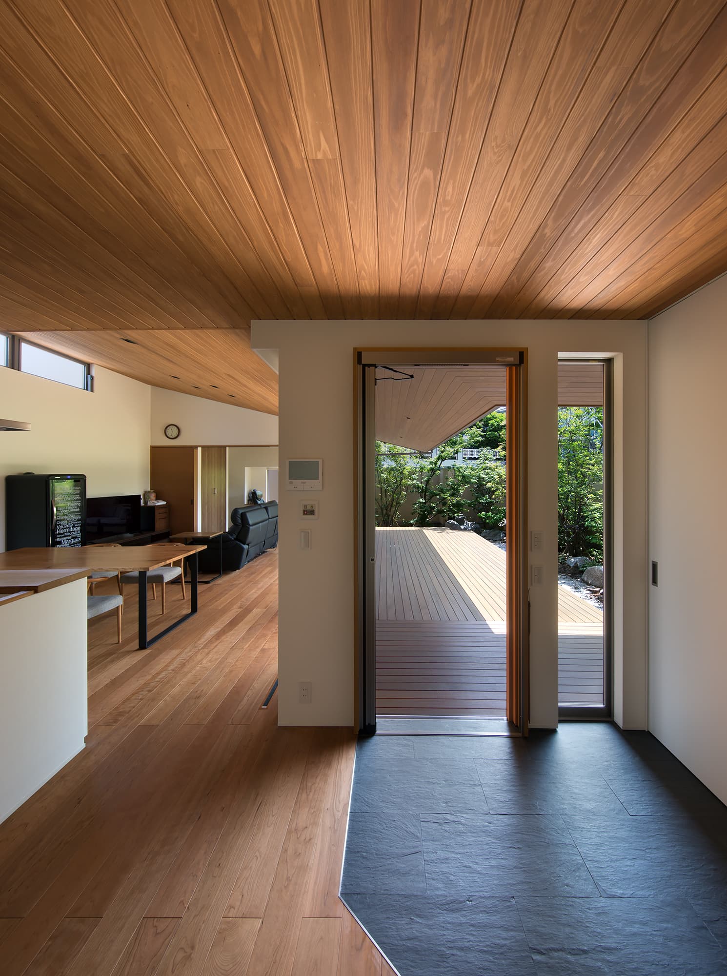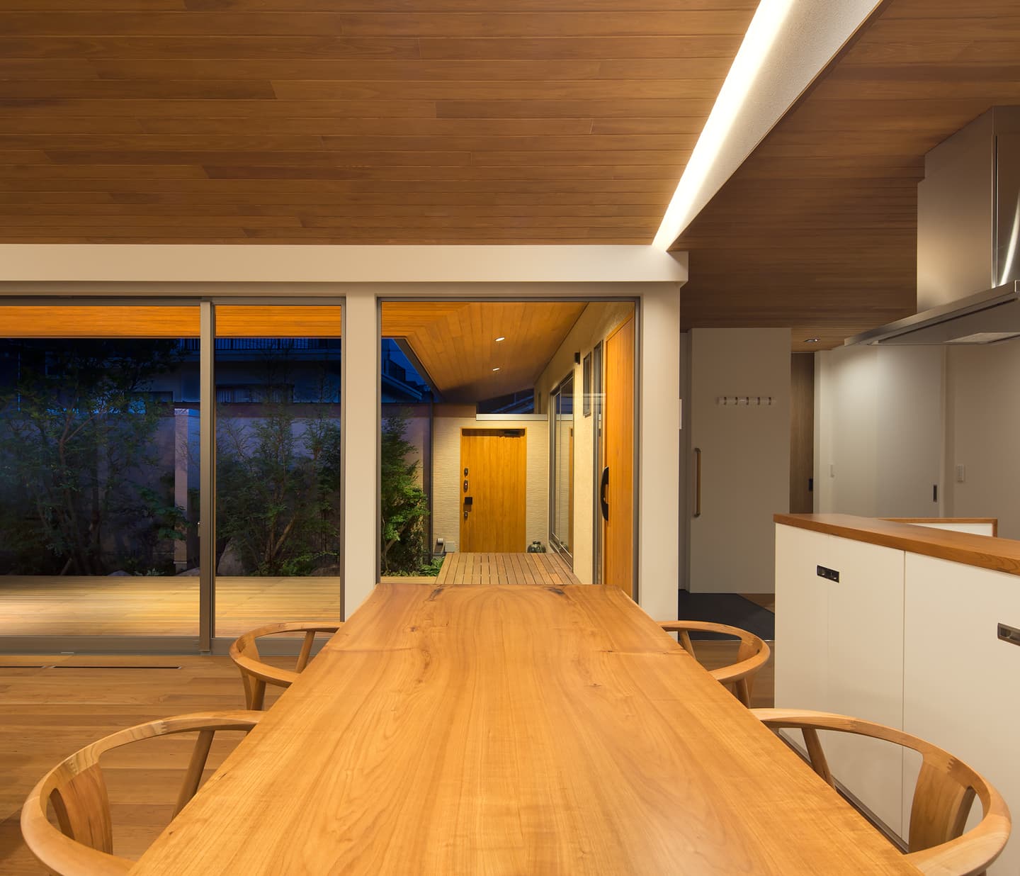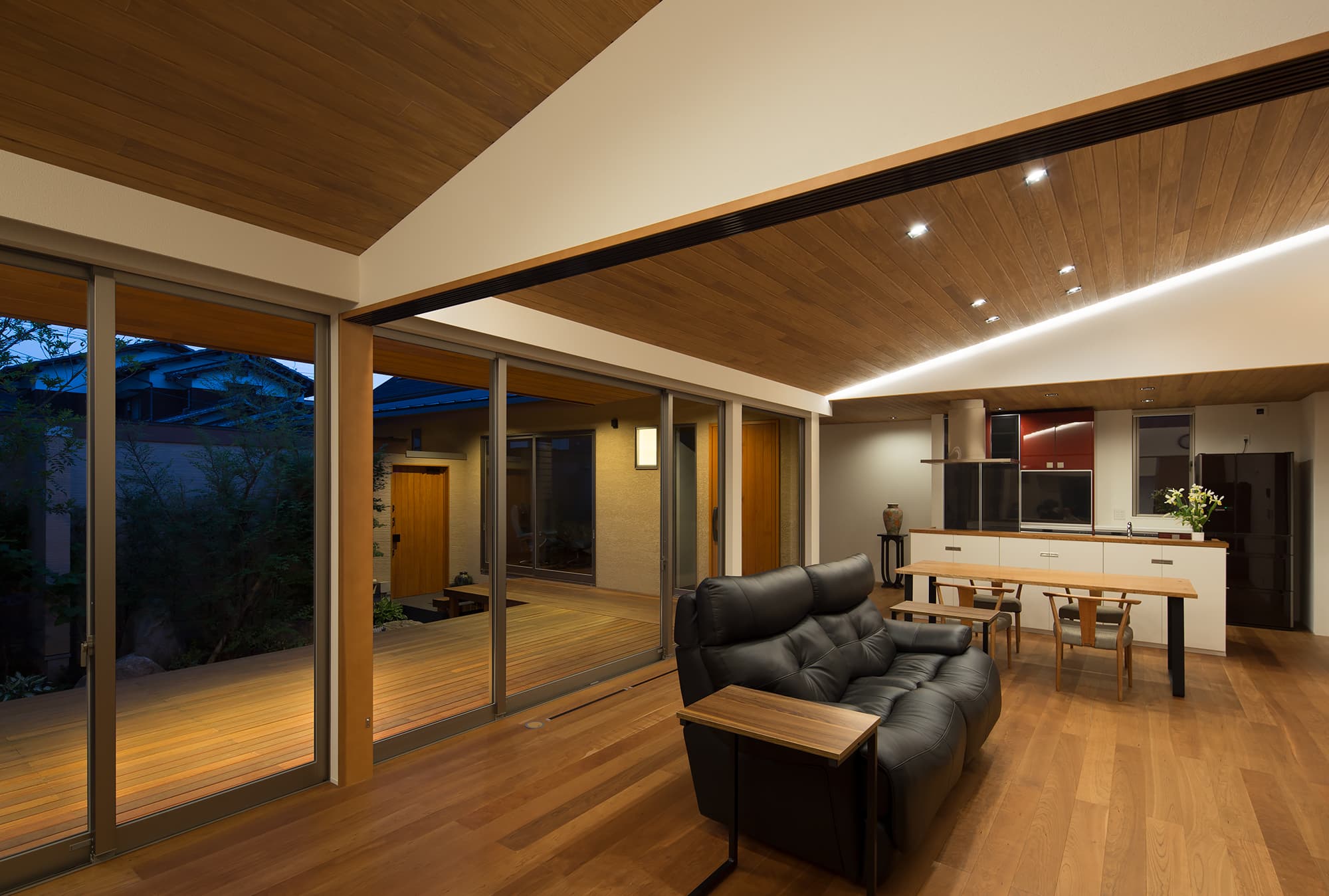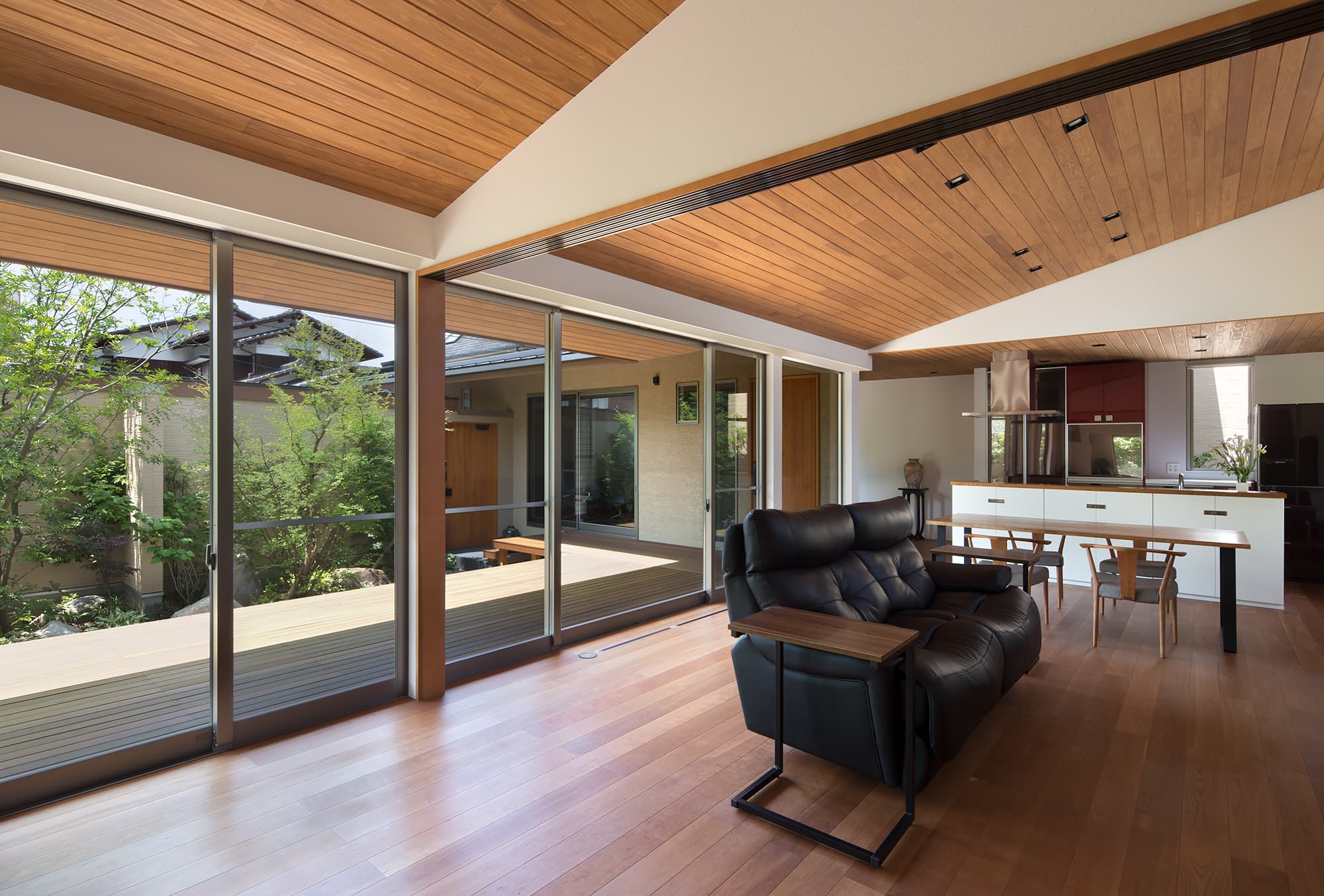 中庭側には1.8mの深い庇、木製デッキを設け外部でもくつろげる設えとしています。中庭側の深い庇は、夏の暑い日差しを遮りますが、冬は部屋内に光が入るように計画しています。
