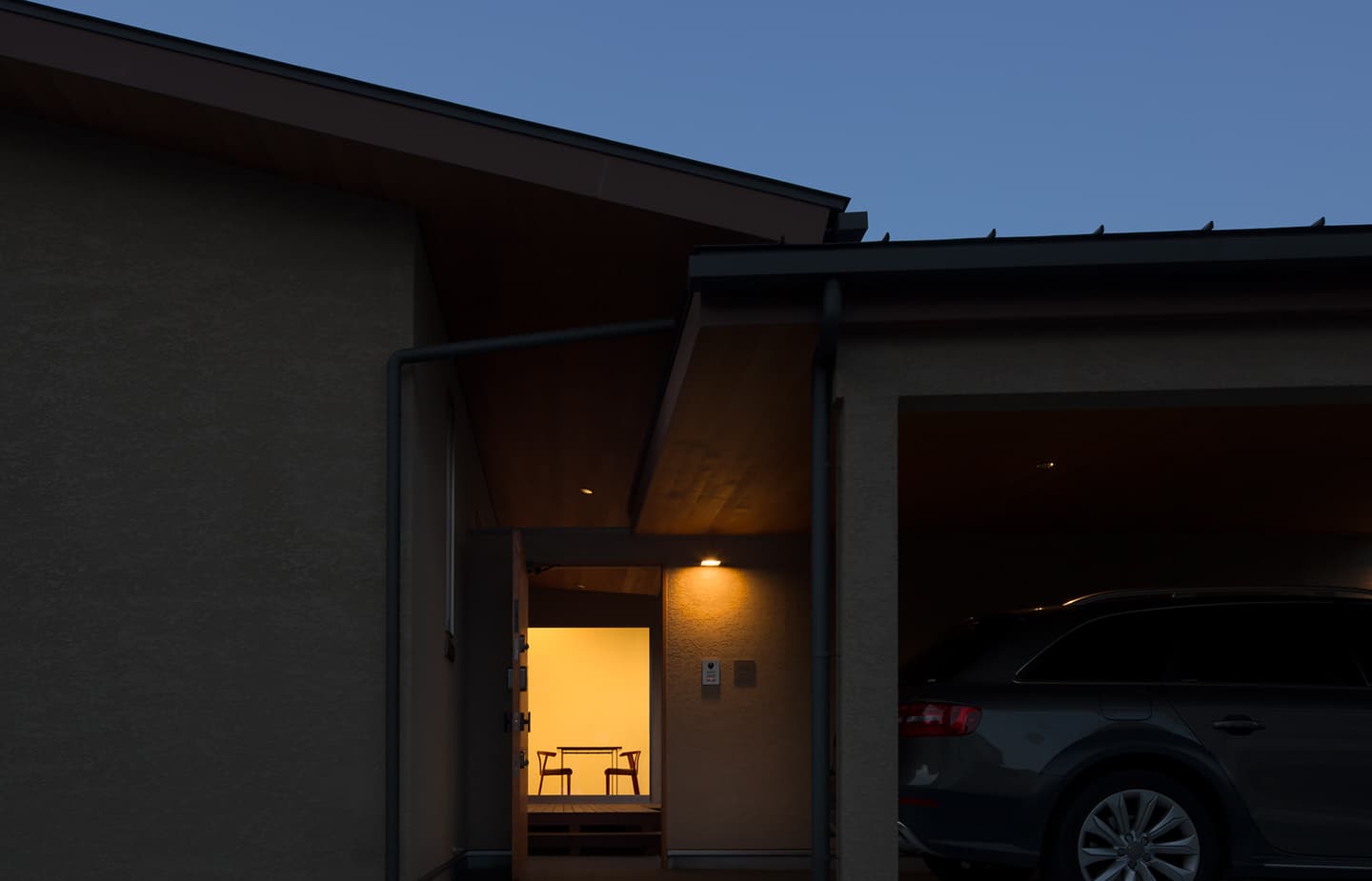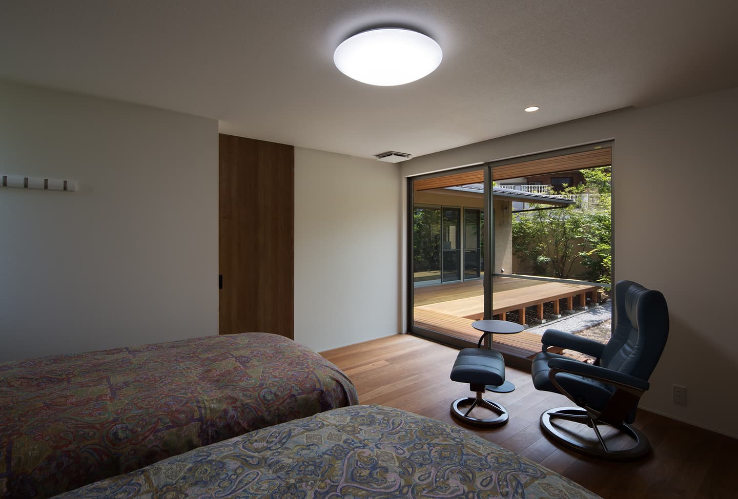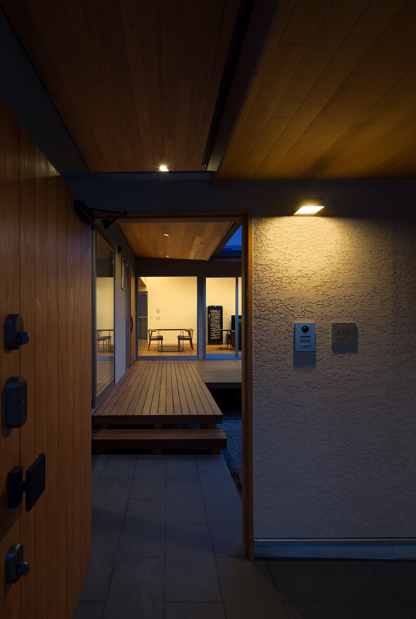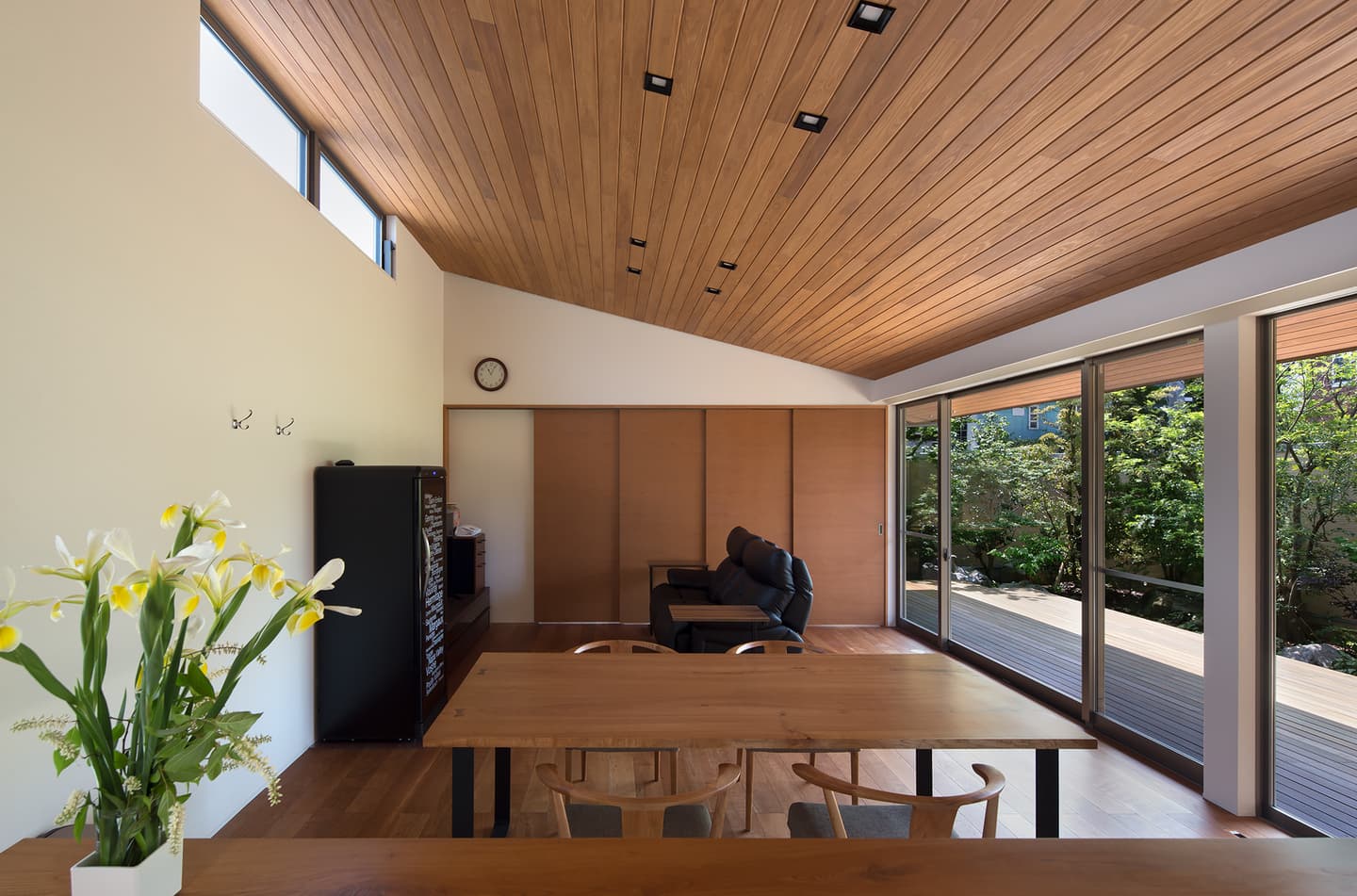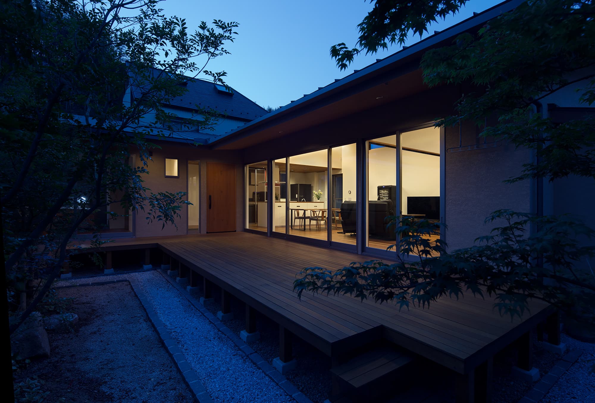 中庭側には1.8mの深い庇、木製デッキを設け外部でもくつろげる設えとしています。中庭側の深い庇は、夏の暑い日差しを遮りますが、冬は部屋内に光が入るように計画しています。
