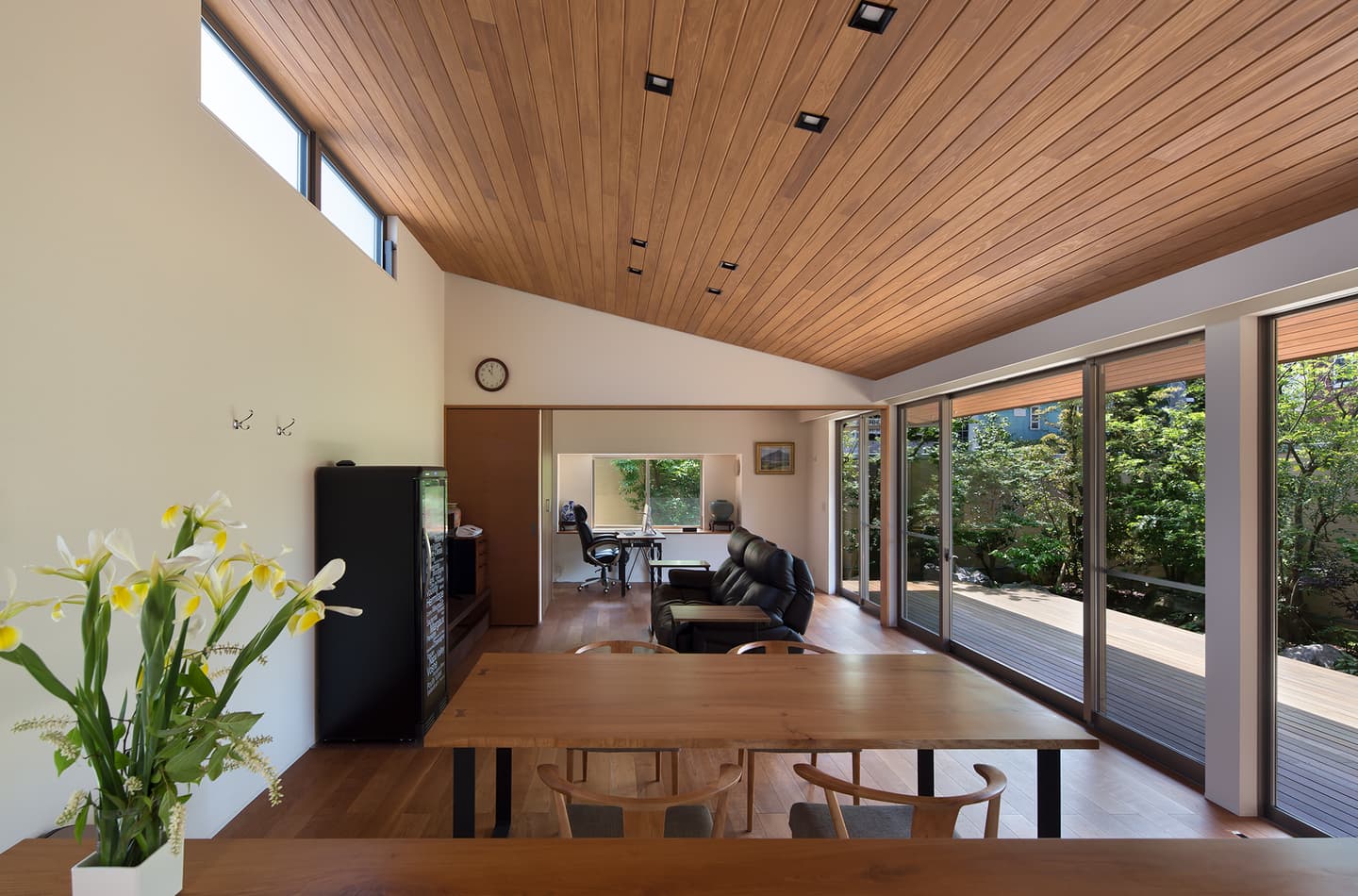 その中庭には背の高い植栽を設け、南東からの視線を遮ります。また、出来るだけ不必要な空間を排除して、コンパクトにまとめながら、広がりのある空間を感じるように、LDK・書斎・寝室の主要な部屋が全て中庭に面し、部屋面積以上に広さを感じるよう開口を大きくとり、中庭と一体となった空間となっています。