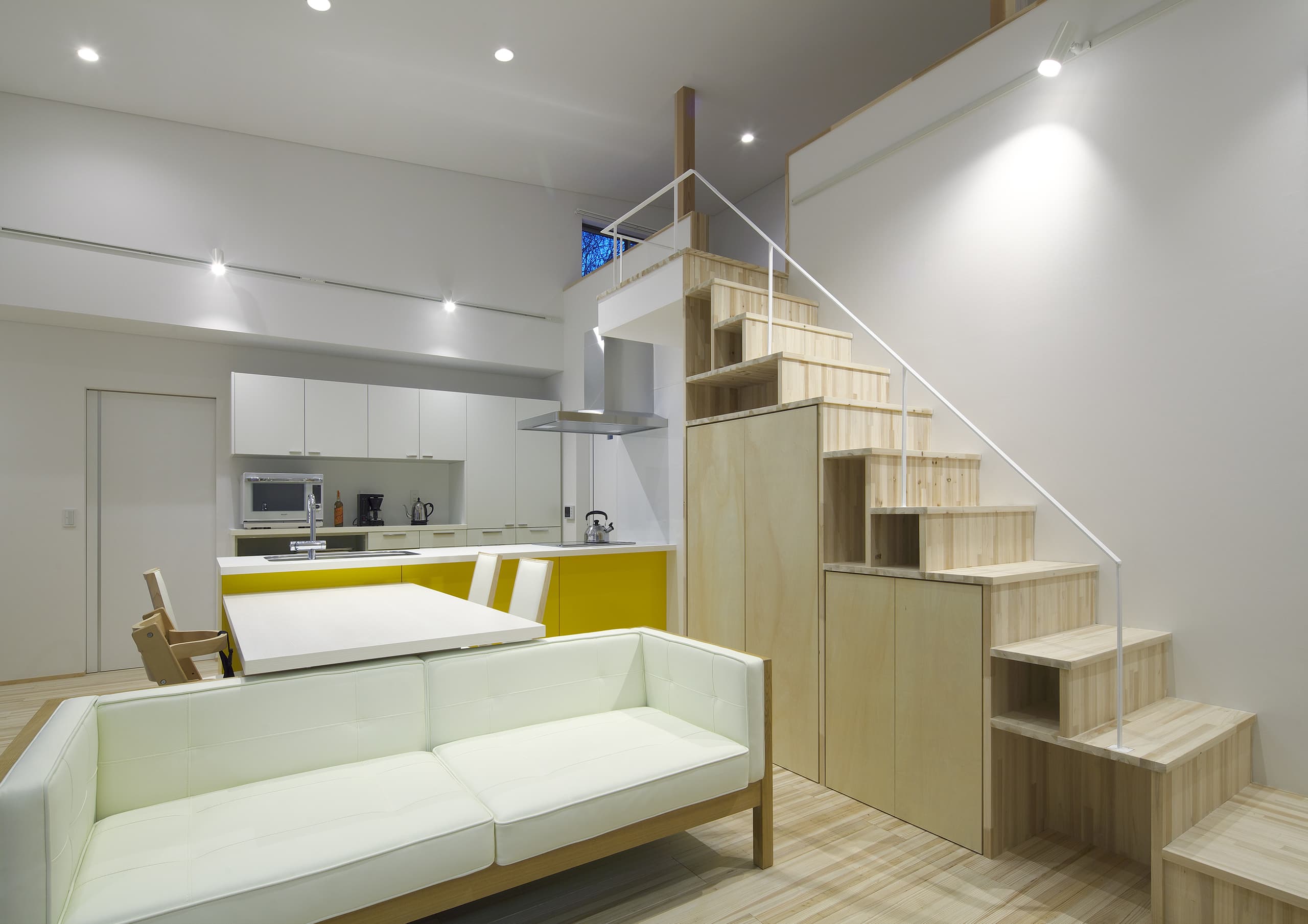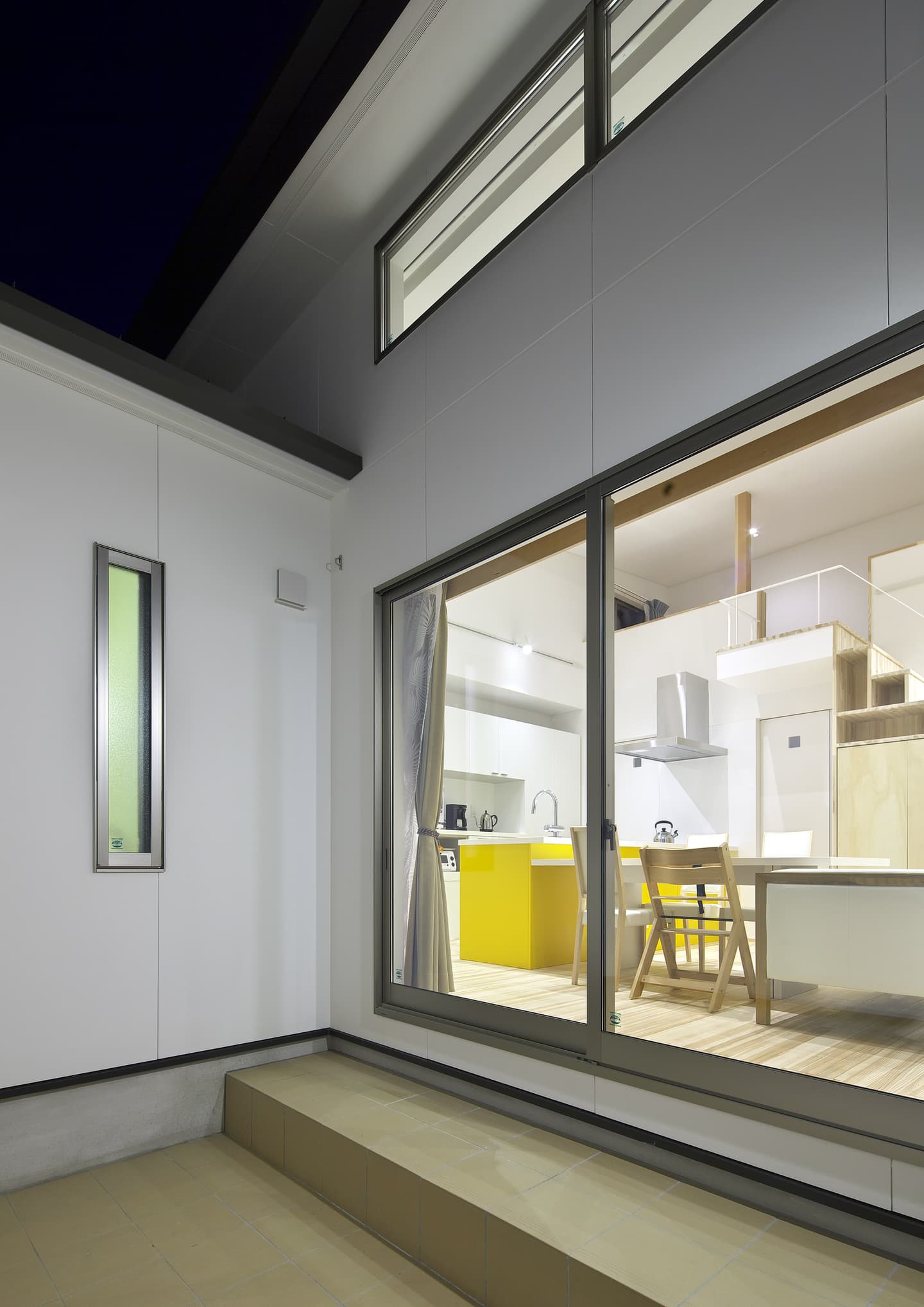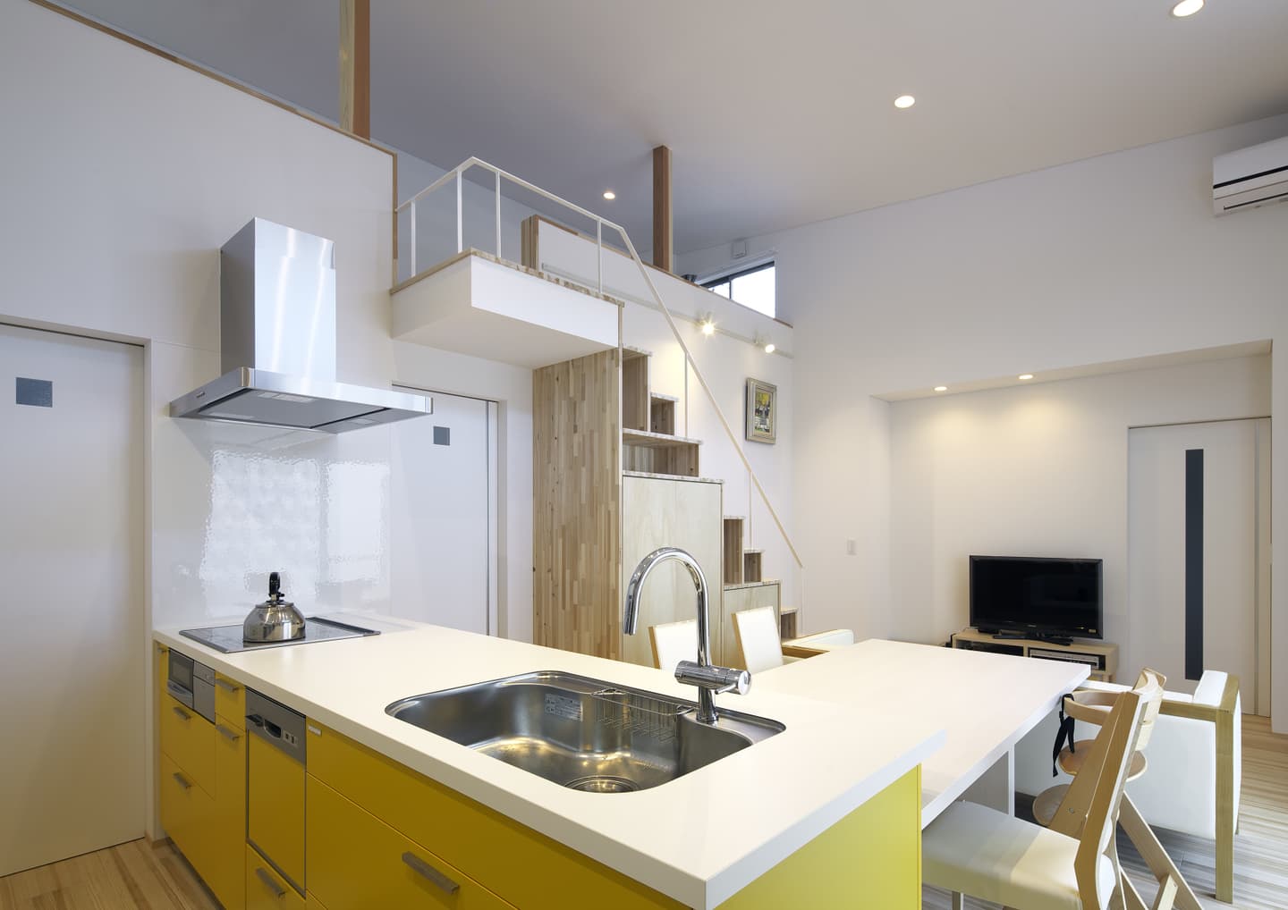 中庭を持ち、プライバシーを確保しつつ、光と変えを取り込み、開放感を創っています。リビングは中庭に面していることと、ロフトを設け吹き抜けでつながることで、広がりのある空間構成となっています。天井の高いリビングダイニングの夏の暑い時期にも熱気を上昇させ、上部の熱をロフトの窓から逃がすことで、可能な限り空調に頼らないパッシブな住宅となります。